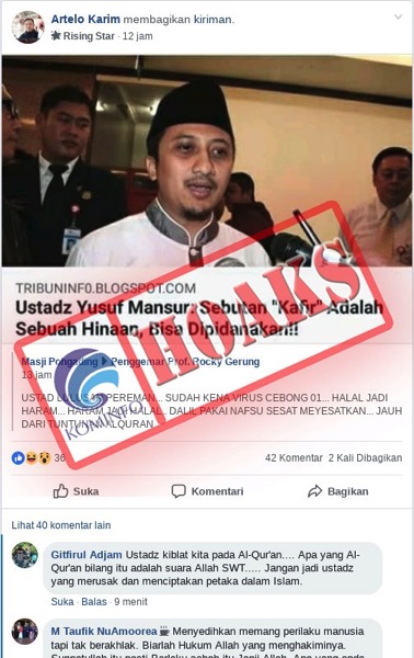 Baca SelengkapnyaBeredar di media sosial (Medsos) Facebook (FB) sebuah gambar hasil tangkapan layar dari sebuah website bernama tribuninf0.blogspot.com. Gambar tersebut menampilkan sebuah artikel berjudul...