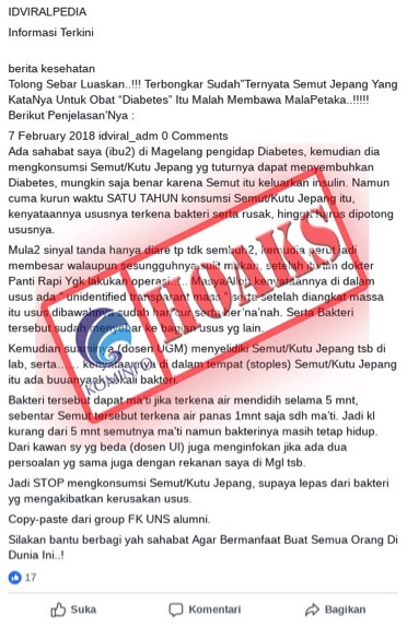 Baca SelengkapnyaTersebar informasi mengenai semut Jepang bisa mengobati diabetes di media sosial yang menyebutkan selain sebagai obat diabetes juga mengandung bakteri yang dapat merusak saluran pencernaan. Pada...