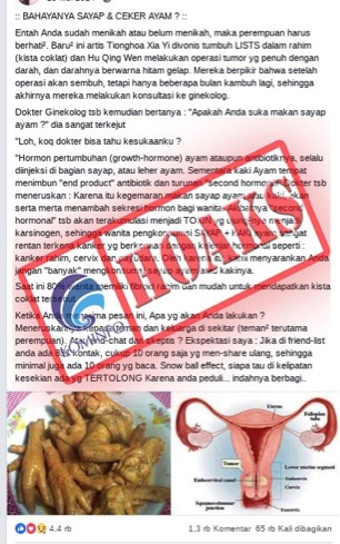 Sudah tersebar informasi di Facebook mengenai bahayanya jika mengkonsumsi sayap dan ceker ayam yang disuntik hormon karena dapat menyebabkan kanker pada wanita. Informasi tersebut disertai dengan...