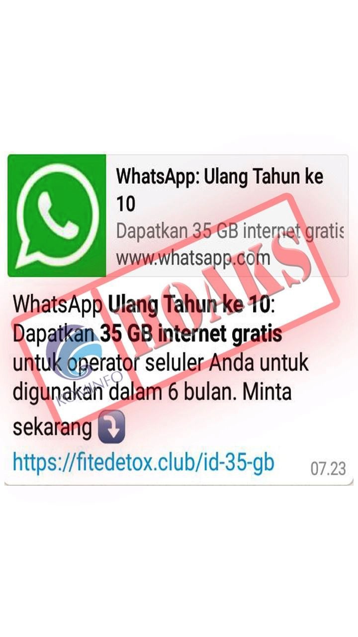 Baca SelengkapnyaHOAX/HOAKS (BERITA BOHONG) Penjelasan: Telah beredar pesan berantai di WhatsApp (WA) yang menyatakan bahwa bertepatan dengan ulang tahun aplikasi whatsApp ke-10, setiap pengguna aplikasi tersebut...