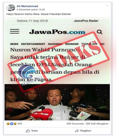 Baca SelengkapnyaKeterangan: Telah beredar postingan Foto dari situs berita Jawapos.com dengan judul Nusron Wahid : saya tidak terima banser di lecehkan OPM, sayalah orang pertama di barisan depan bila di kirim ke...