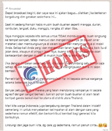 Beredar pada aplikasi chatting Whatsapp, informasi tentang tanaman dan buah-buahan dengan narasi “Saat ini sedang/hampir habis musim buah-buahan seperti mangga, durian, rambutan, langsat, duku, manggis, nangka, dll akan tiba”.