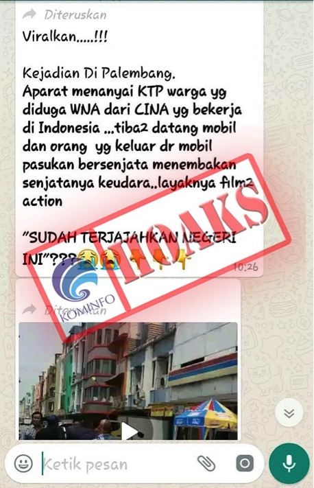 Baca SelengkapnyaTelah Beredar sebuah pesan berantai di WhatsApp (WA) dengan narasi; "Viralkan.....!!!Kejadian Di Palembang yang berisikan informasi mengenai aparat menanyai KTP warga yang diduga warga negara...