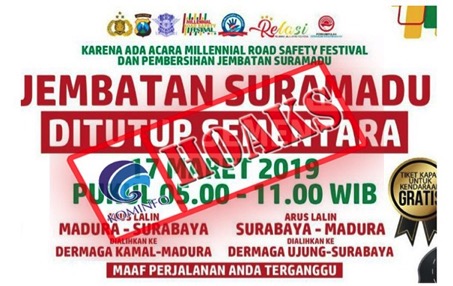 Telah beredar sebuah flyer (Pamflet/Selebaran) di media sosial yang berisi informasi mengenai adanya penutupan Jembatan Suramadu yang akan diberlakukan pada tanggal 17 Maret 2019 karena akan diadakan...