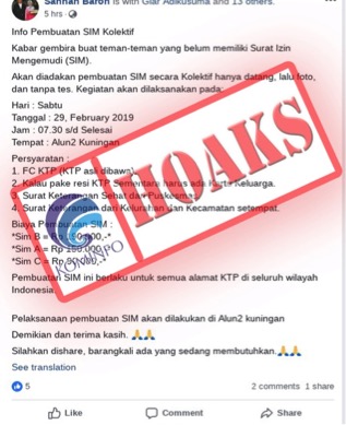 Baca SelengkapnyaTelah beredar di grup jejaring sosial Facebook (FB) mengenai informasi pembuatan surat izin mengemudi (SIM) yang dilakukan secara kolektif di Kabupaten Kuningan, Jawa Barat. Tertulis dalam informasi...
