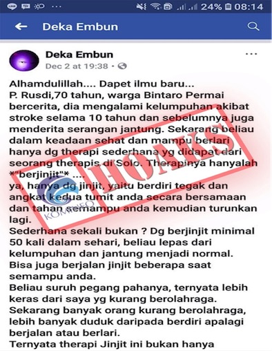 Baca SelengkapnyaPenjelasan : Beberapa waktu lalu, viral cerita mengenai seorang pria yang sembuh dari stroke hanya dengan melakukan terapi jinjit selama 50 kali dalam sehari. Menurut ahli bedah saraf, dr Roslan...