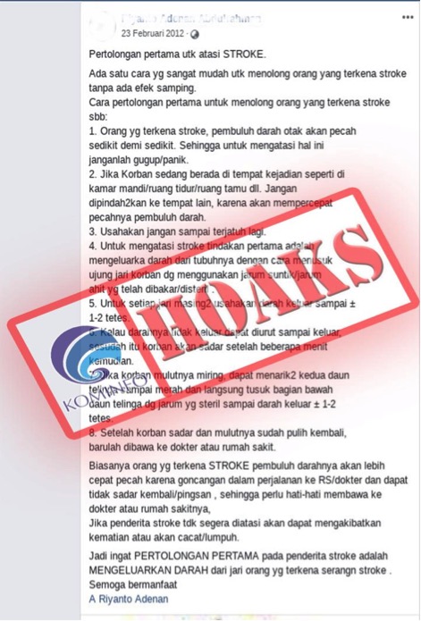 Hoaks/Disinformasi Keterangan: Telah banyak beredar informasi mengenai beberapa hal yang harus dilakukan sebagai pertolongan pertama pada serangan stroke yang salah satu pointya adalah...