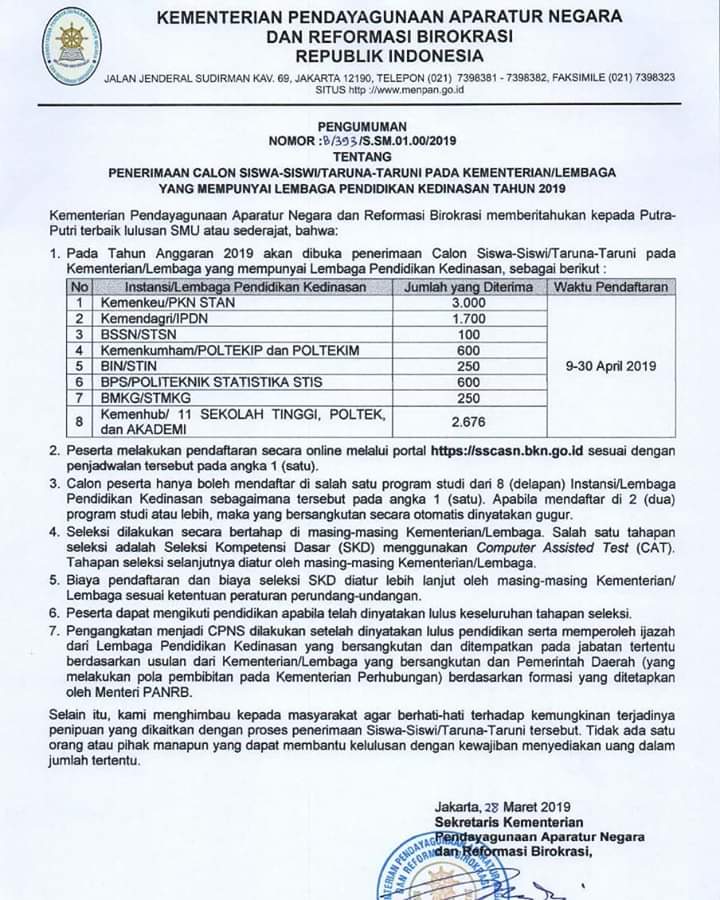 JAKARTA – Pemerintah kembali membuka penerimaan calon mahasiswa-mahasiswi/taruna-taruni pada lembaga pendidikan kedinasan sebagai salah satu jalur seleksi Calon Pegawai Negeri Sipil (CPNS). Seperti tahun lalu, ada 19 pendidikan tinggi kedinasan di delapan Kementerian/Lembaga yang membuka kesempatan bagi generasi muda yang memenuhi syarat untuk mengikuti seleksi. Untuk tahun ini, dibuka 9.176 kursi calon siswa-siswi/taruna-taruni. Adapun waktu pendaftaran pada tanggal 9-30 April 2019.